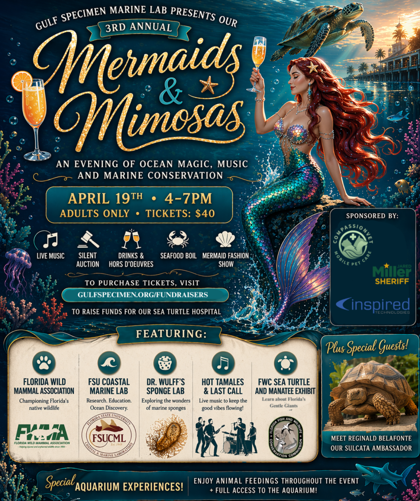Join us for Mermaids & Mimosas, a magical evening at Gulf Specimen Marine Lab that brings together ocean-inspired elegance and a great cause. Guests will enjoy refreshing mimosas and specialty drinks, delicious hors d’oeuvres, and live music while exploring the lab after hours.